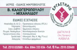 Ειδικός ΜικροβιολόγοςΕιδικές Εξετάσεις Ηπατίτιδος(Α,Β,C,)- Υπέρτασης- Σακχαρώδη Διαβήτη - Προγεννητικού ελέγχουΟστεοπόρωσης - Ορμονικού ΕλέγχουΔέχεται καθημερινά 07:30 -14:00 και 18:00 -20:00 εκτός Τετάρτης Απογεύματος και Σάββατο 08:00 -11:00