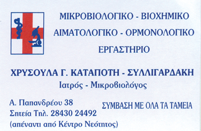 Αιματολογικές, μικροβιολογικές, βιοχημικές, ορμονολογικές εξετάσεις, αιμοληψίες κατ' οίκον.Δέχεται καθημερινά 07:30 - 14:00.
